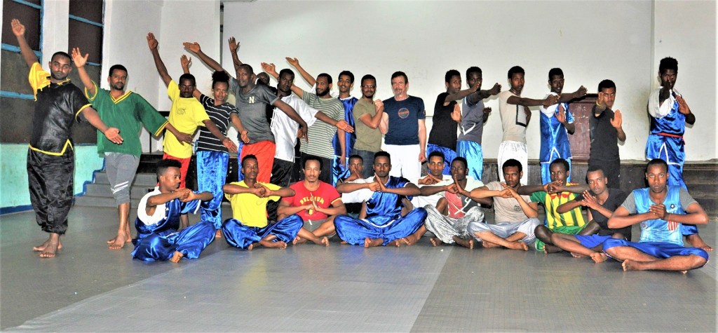 Above is part of Ethiopia’s National Wushu Kung Fu team with Master Tofik center left and Stone Dragon center right. (2018) 上图是埃塞俄比亚国家武术队的一员,托菲克大师在左中,石龙在右中。(2018)