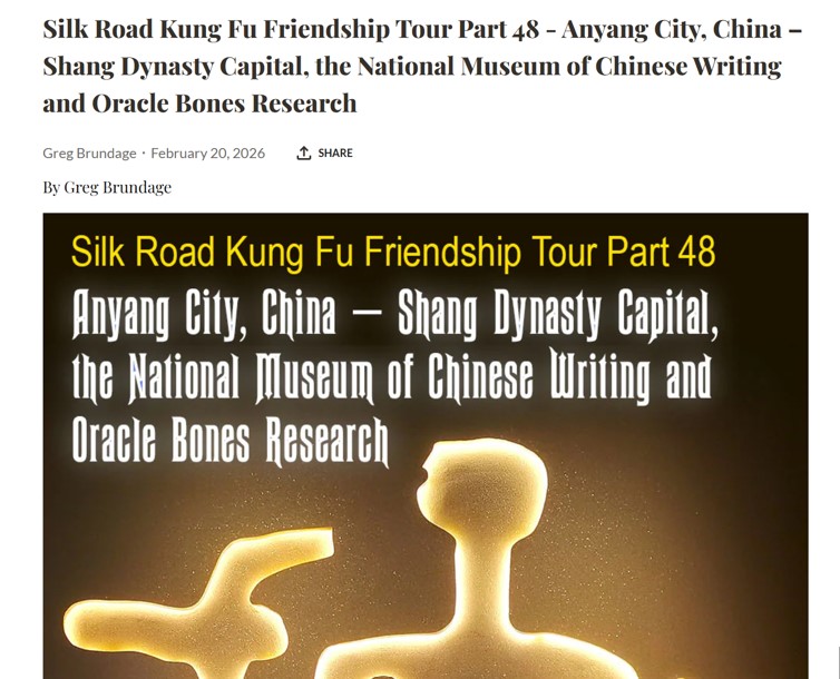 好消息!《功夫太极杂志》重新上线了,比以往更好,只是旧文章有收费墙。这没关系,因为编辑Gene Ching也需要赚钱。😃 给他一点宽容吧!无论如何,新文章仍然是免费的,我在安阳撰写的一系列文章中的第一篇——关于商朝文明的殷墟考古遗址——现在在首页。这一系列共有六篇文章,涵盖从中国文字的起源、世界上第一位伟大的战士/女王/大祭司傅子女士,到功夫的起源等内容!