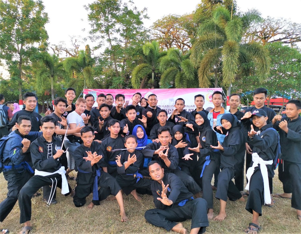 Incredibly talented, really fun Pencak Silat players of Banjar Baru Indonesia pose with Silk Road Kung Fu Friendship Tour Traveler Stone Dragon.