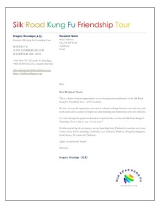 During the past seven years I invested at least 150,000 RMB in the Silk Road Kung Fu Friendship Tour – with no sponsors. That’s OK – because this is what I love to do. However, now time is an issue. Some negative forces are creating all kinds of divisions in the world, and people who build bridges need to work faster. Some sponsors would really help that.