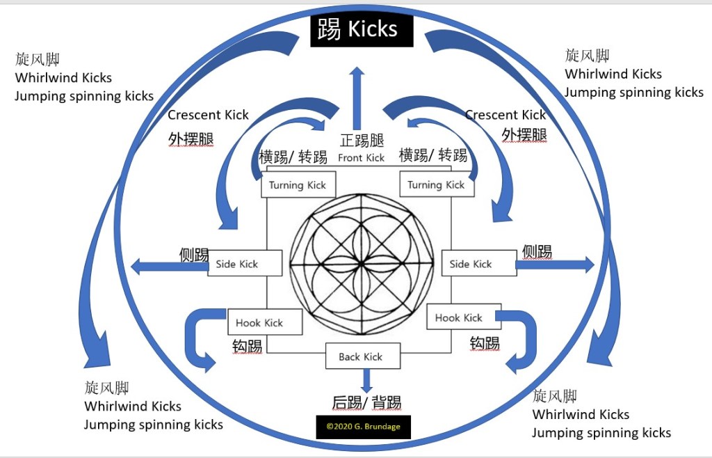 Below is application of a mandala from Shotokan Karate, to present a somewhat standardized system of naming kicks and showing movement over time.